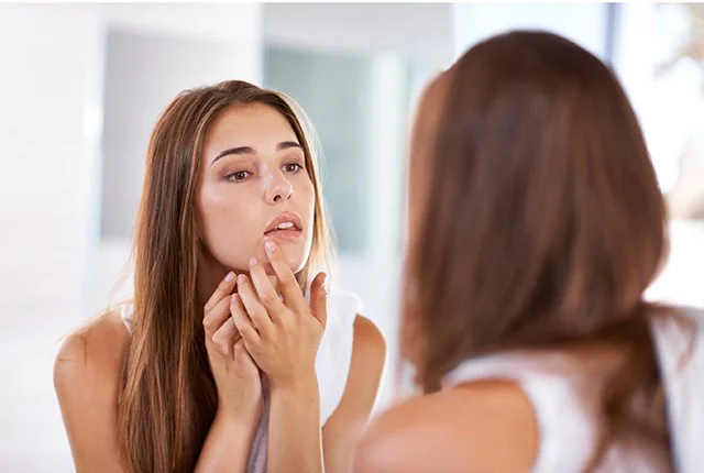 Dry, flaky skin. While the hormonal imbalance that sends our sebaceous glands haywire, triggering the production of too much oil, is partially to blame, there’s another step involved in the formation of acne, and that involves dry, dead skin cells. The cooler fall and winter months typically tend to zap moisture from the skin, as will the forced heat that comes with those times, long, hot showers, or sunburns during the warmer months. Avoid using too many salicylic acid-based acne treatments, as well as alcohol-based cosmetics, and formulas containing sulfates.