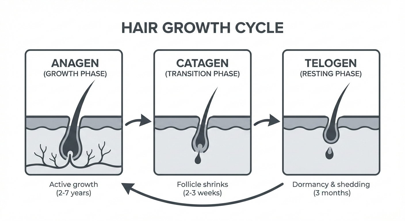 Telogen (resting phase): Hair is released and eventually sheds, making room for new growth.